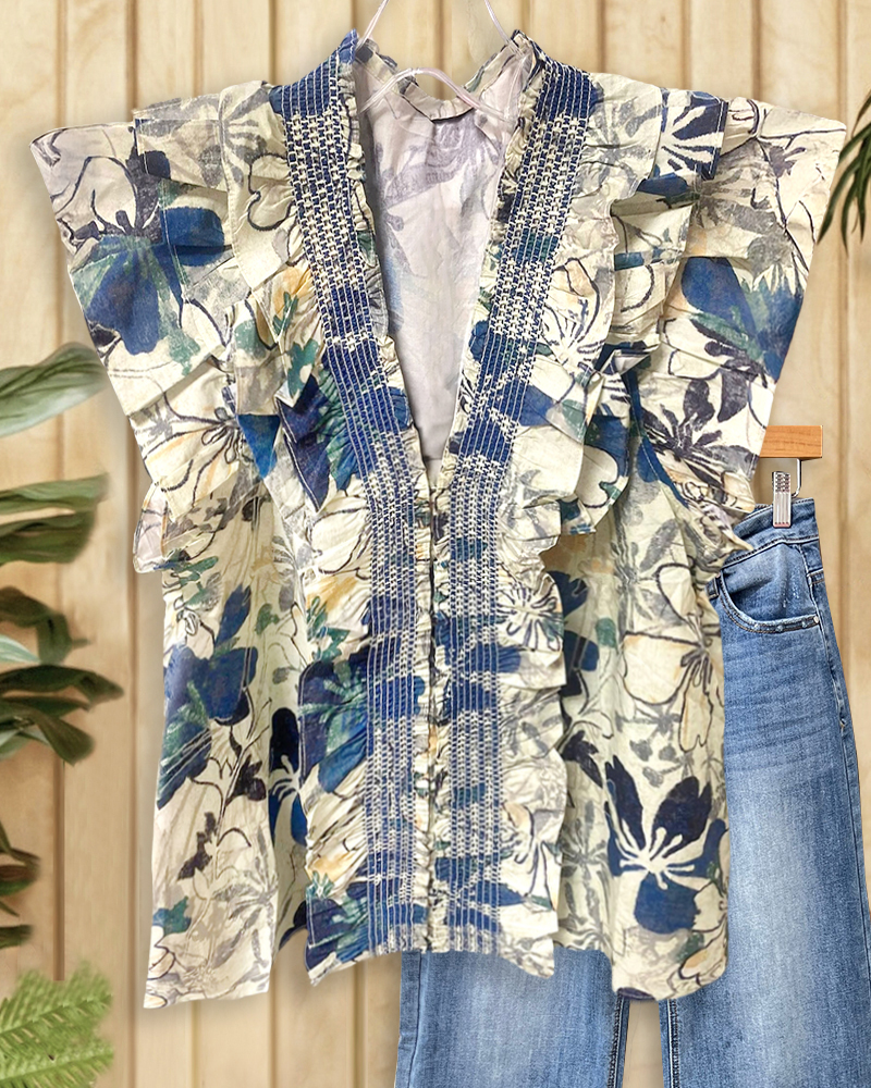 Floral Print Smocked Ruffles Glamorous V Neck Blouse