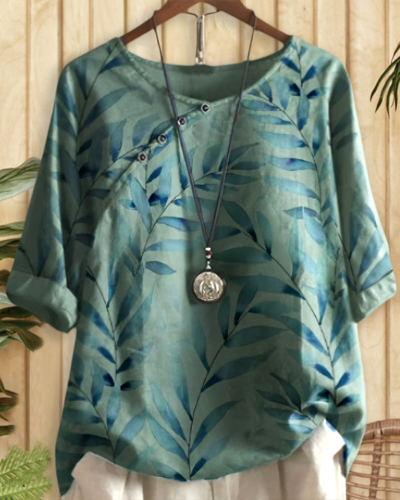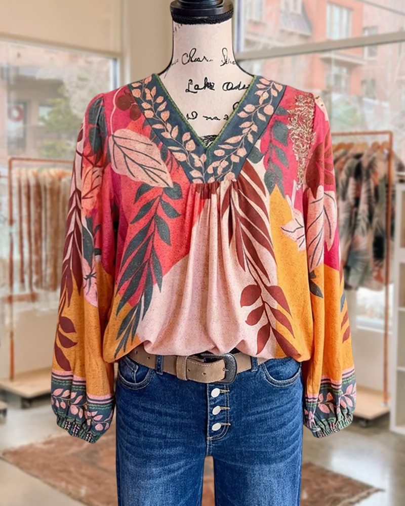 Leaf Print Tropical V Neck Lantern Sleeve Blouse