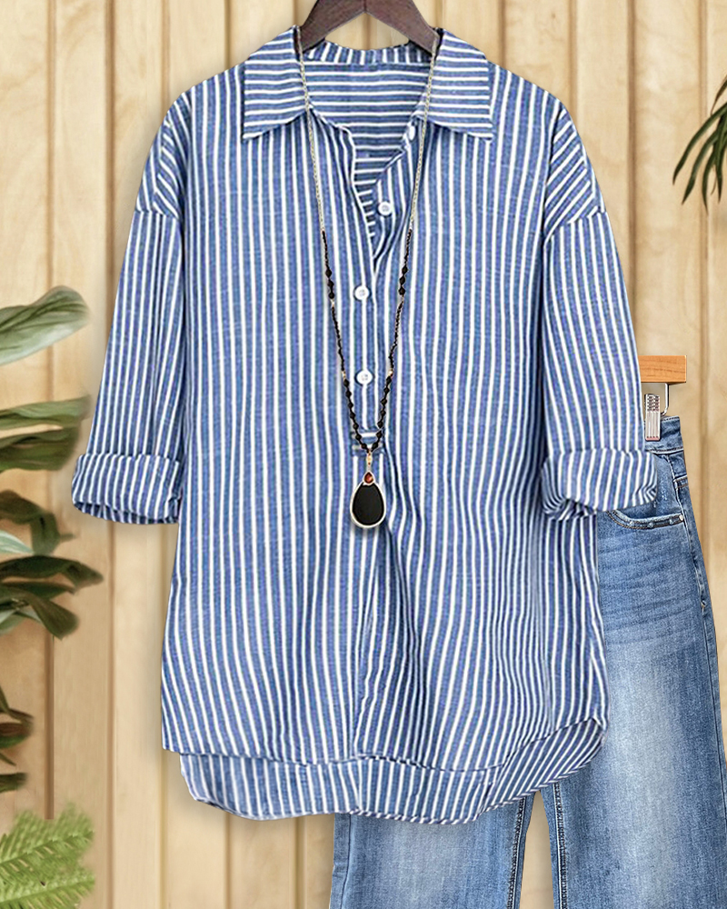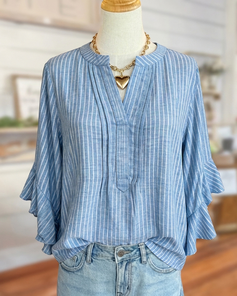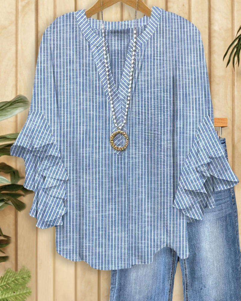 Striped Rocking Ruffle Sleeve V Neck Blouse