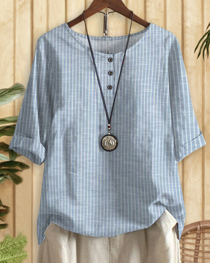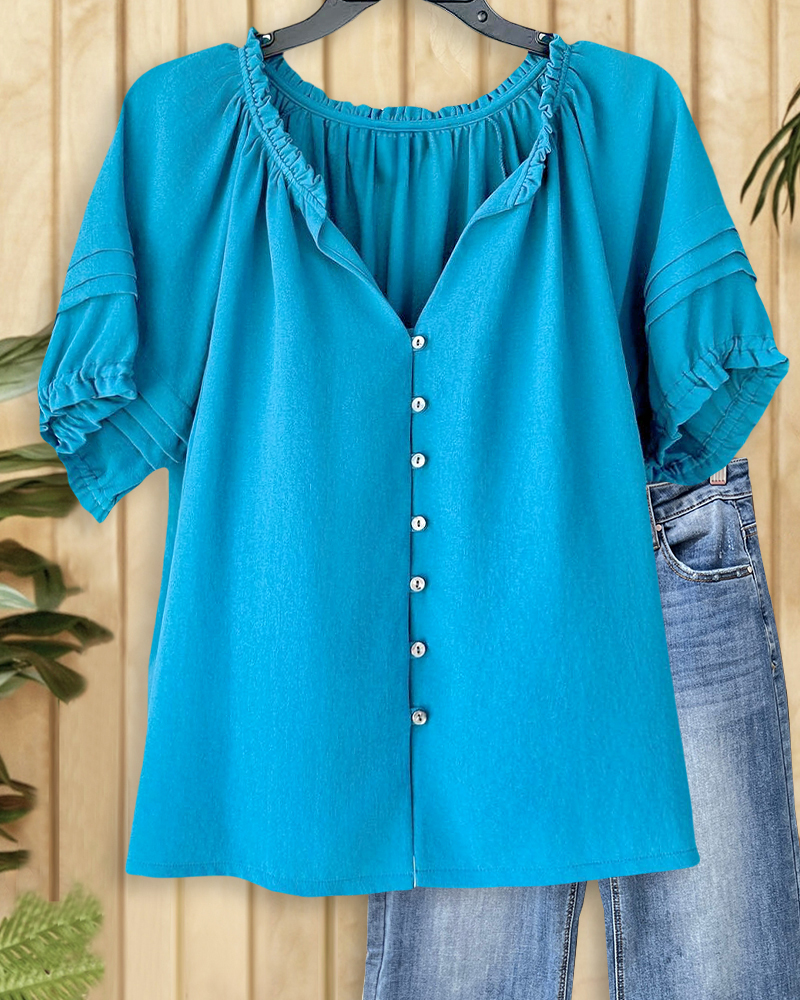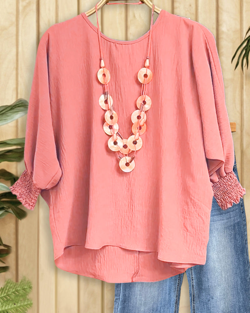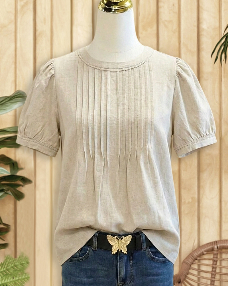 Solid Color Pleated Detail Casual Round Neck Blouse