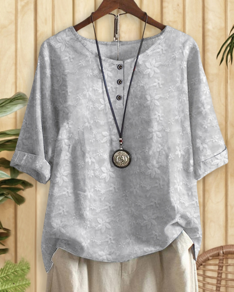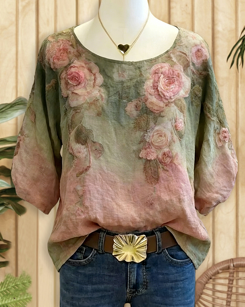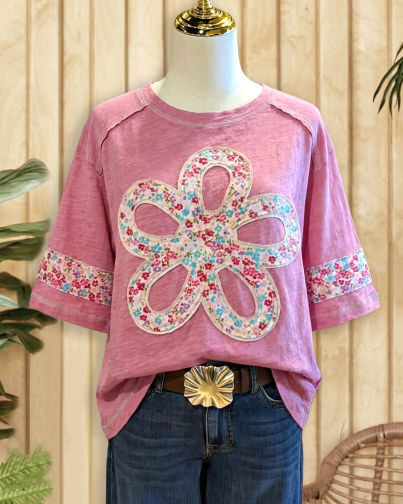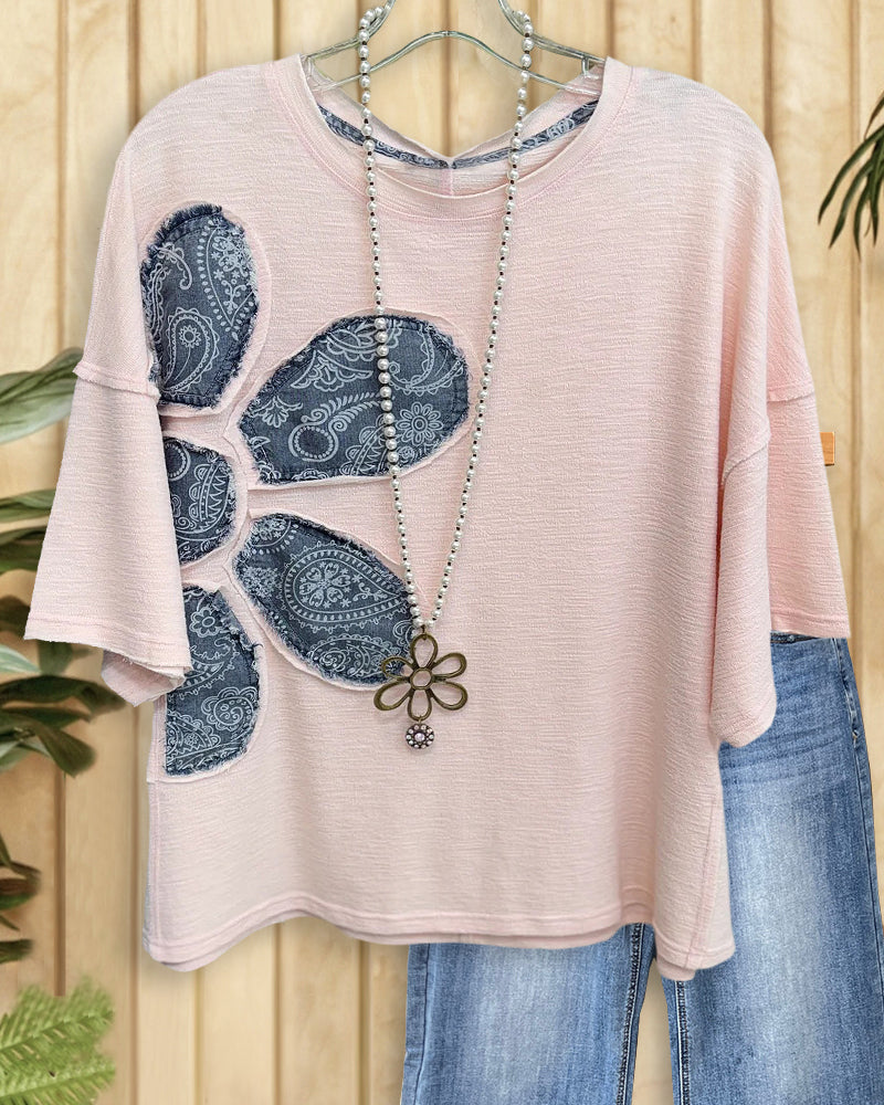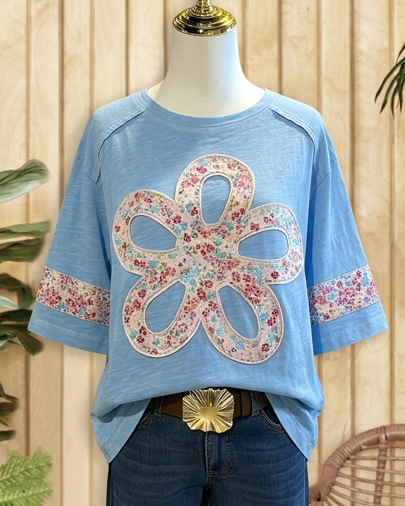Floral Applique Round Neck Casual Drop-Shoulder Shirt