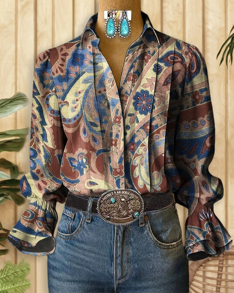 Paisley Print Trumpet Sleeve Rocking Button Up Blouse