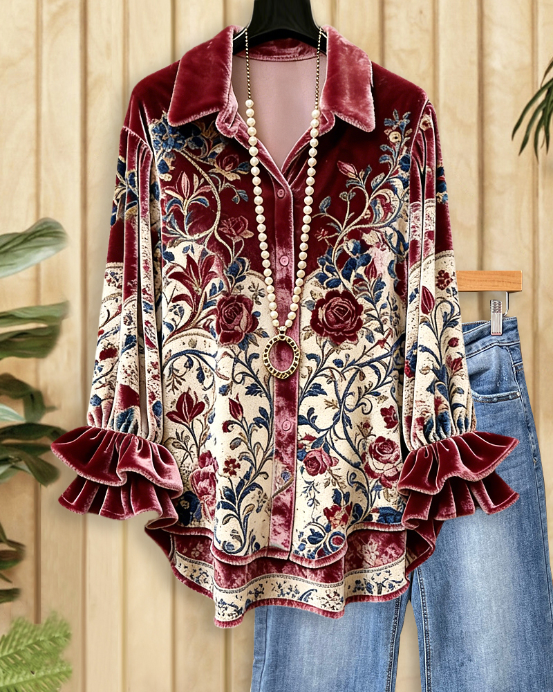 Velvet Floral Print Retro Ruffle Sleeve Button Up Blouse