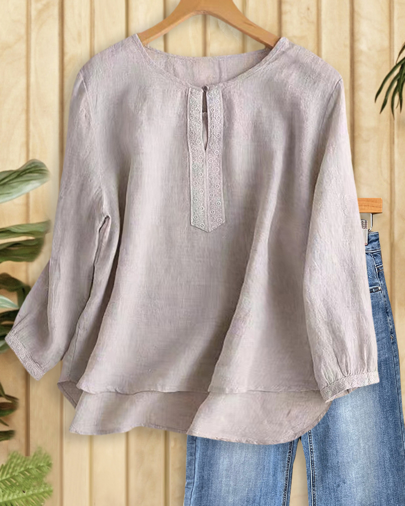 Solid Color Lacy Trim Retro Round Neck Blouse