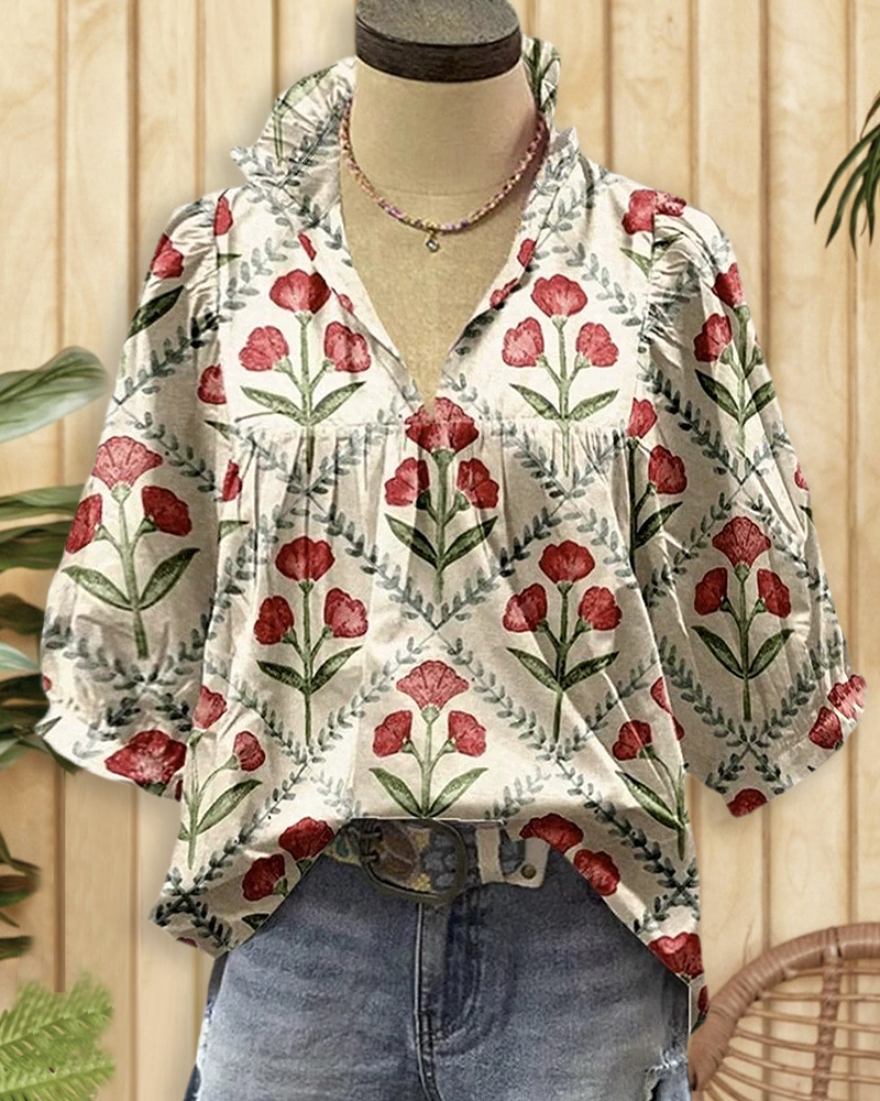Floral Print Bohemia V Neck Ruffle Sleeve Blouse
