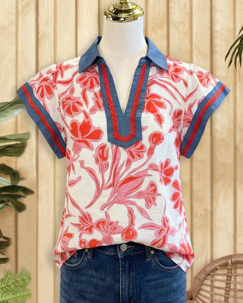Butterfly & Floral Print Color Block Pretty V Neck Shirt