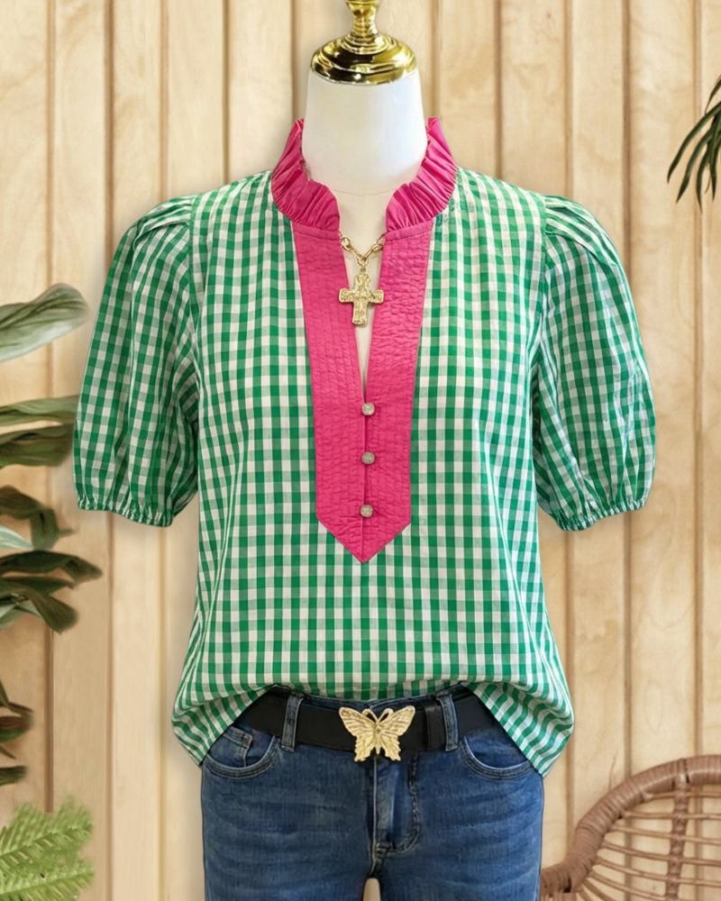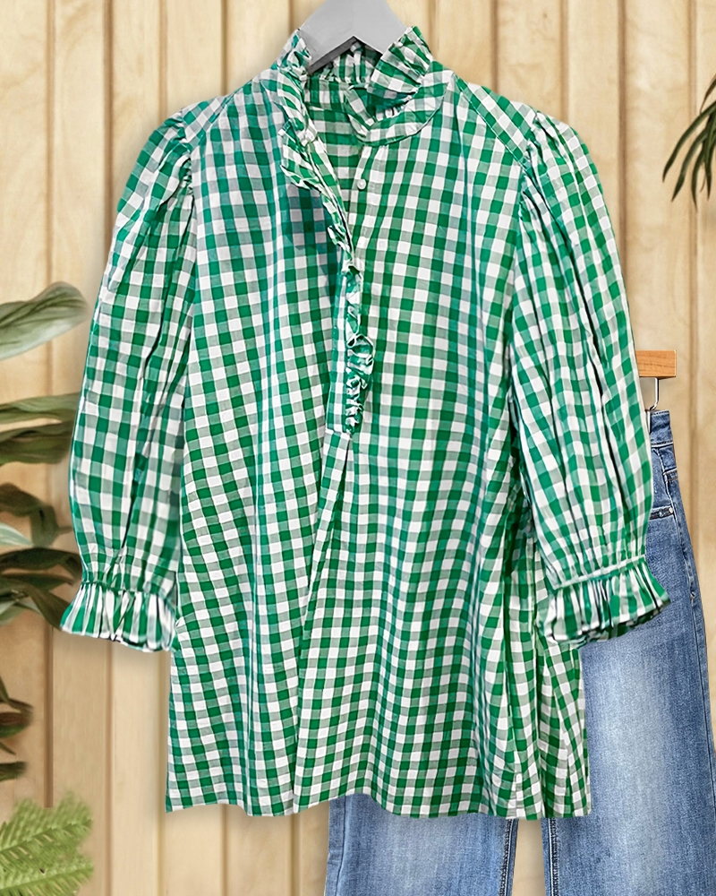 Gingham Feminine Puff Sleeve Ruffles Trim Blouse
