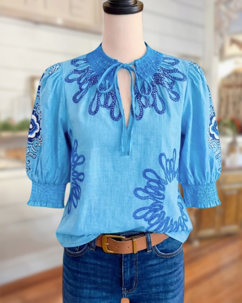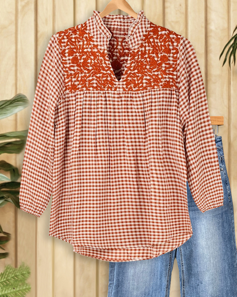 Floral Embroidery Gingham Cute Lantern Sleeve Blouse
