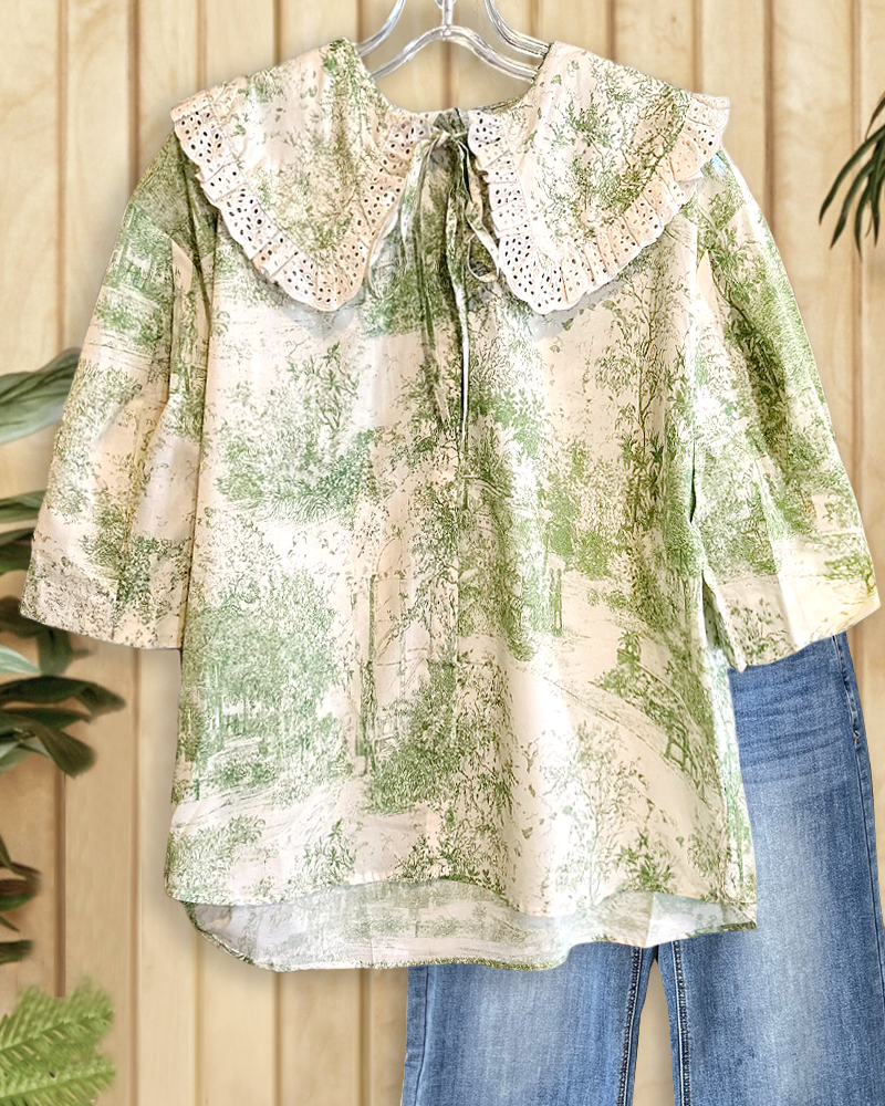 Natural Print Doll Collar Tie Front Laid Back Blouse