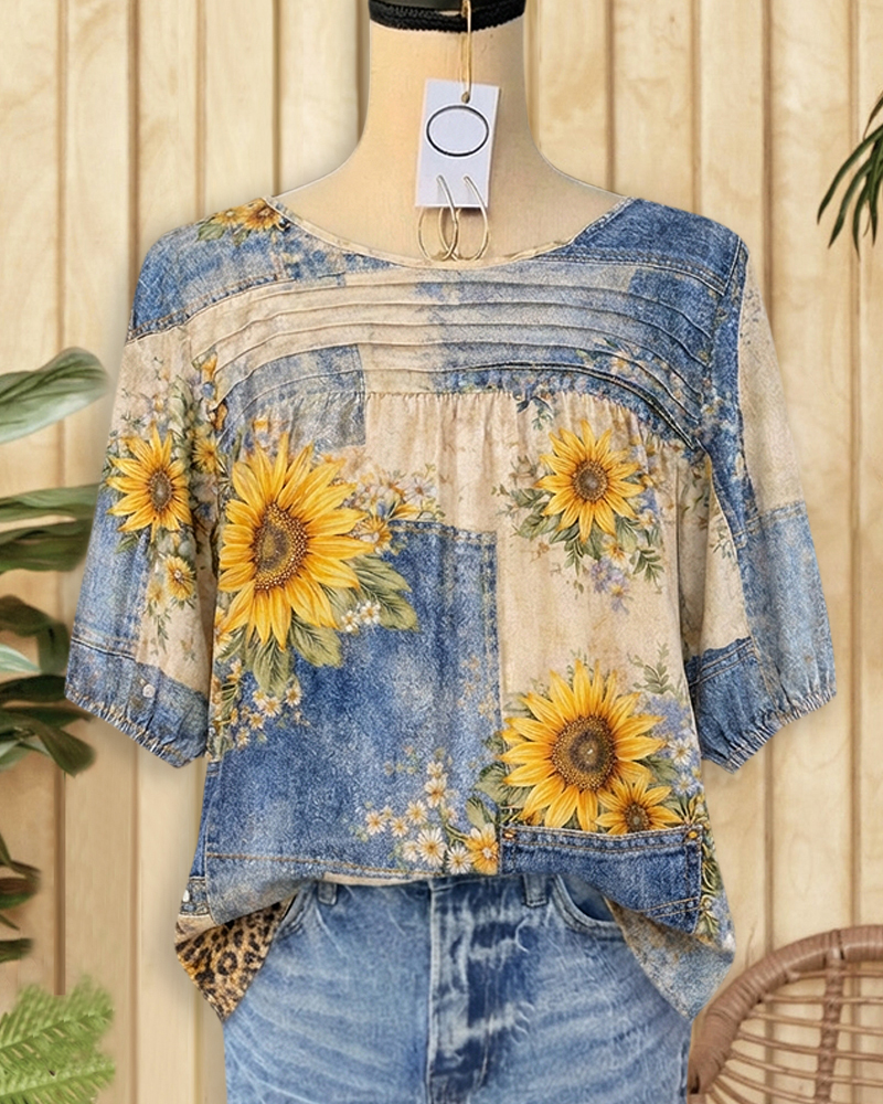 Floral Print Bright Round Neck Pleated Detail Blouse