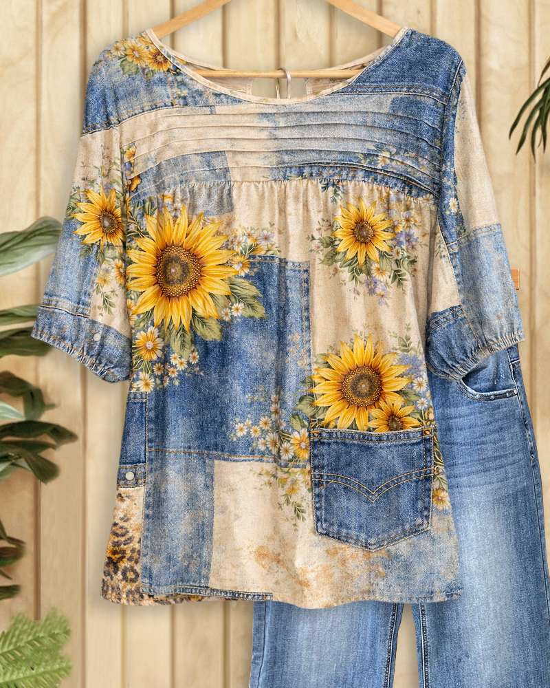 Patchwork Relaxed Round Neck Seamed Detail Shirt