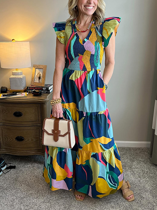NEW🔥 Ruffle Sleeve Stretch Colorful Printed Dress