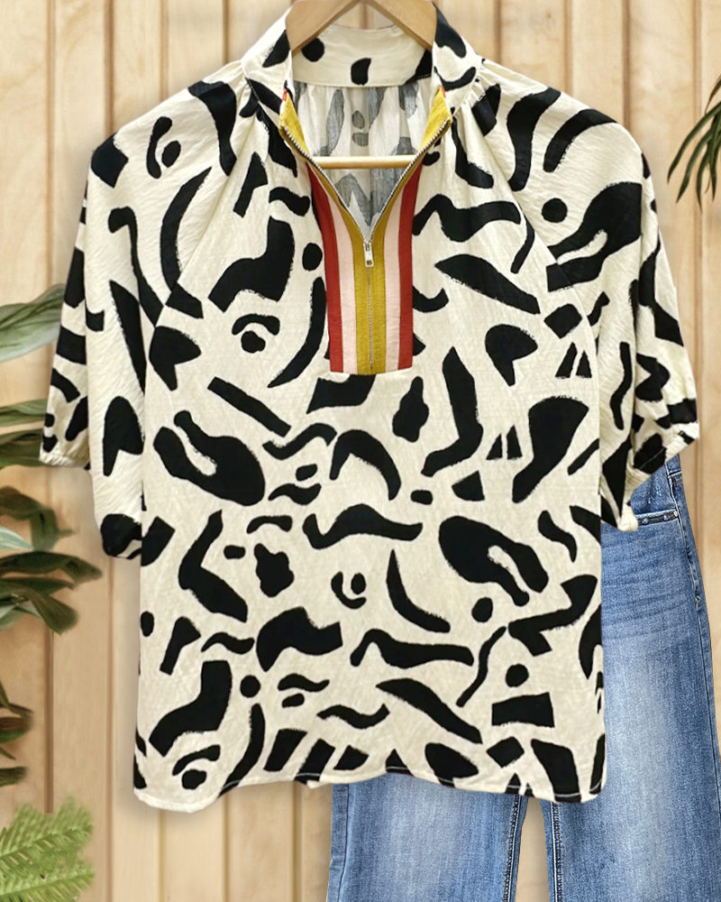 Abstract print blouse with zippered design, sleek and perfect for commuting or smart casual looks