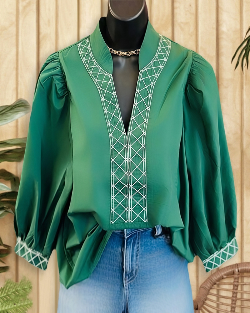 Retro V-neck blouse with contrast stitching and puff sleeves, perfect for work, brunch, and stylish daily wear.
