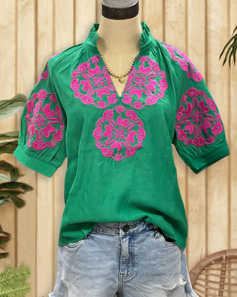 Sophisticated V-neck blouse with delicate floral embroidery details.