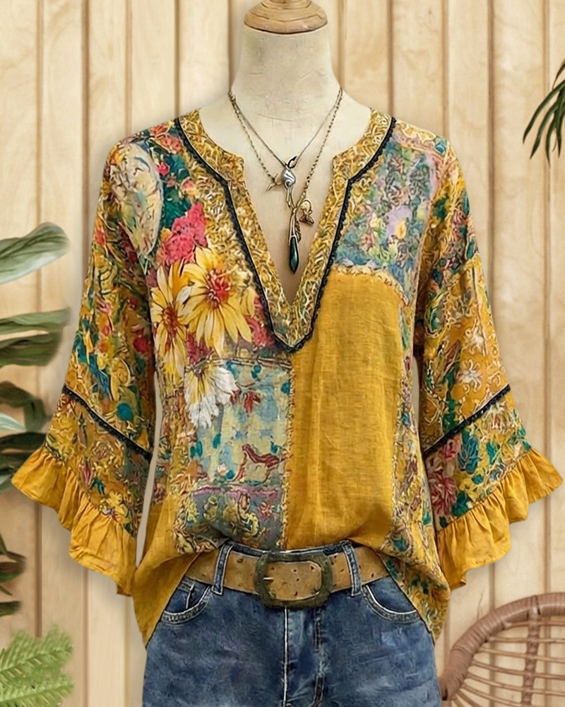 Bohemia floral print V neck blouse with ruffle sleeves for relaxed, chic wear.