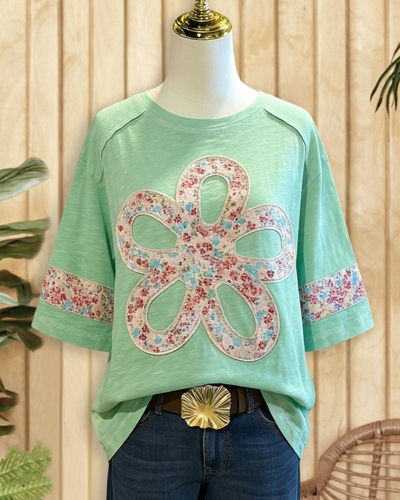 Cute round-neck shirt with flower applique for a playful, feminine style