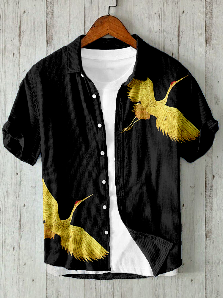 Gold Cranes Art Linen Blend Short Sleeve Shirt