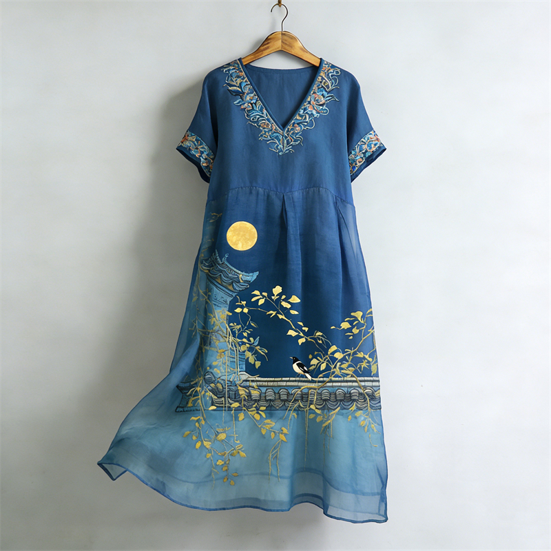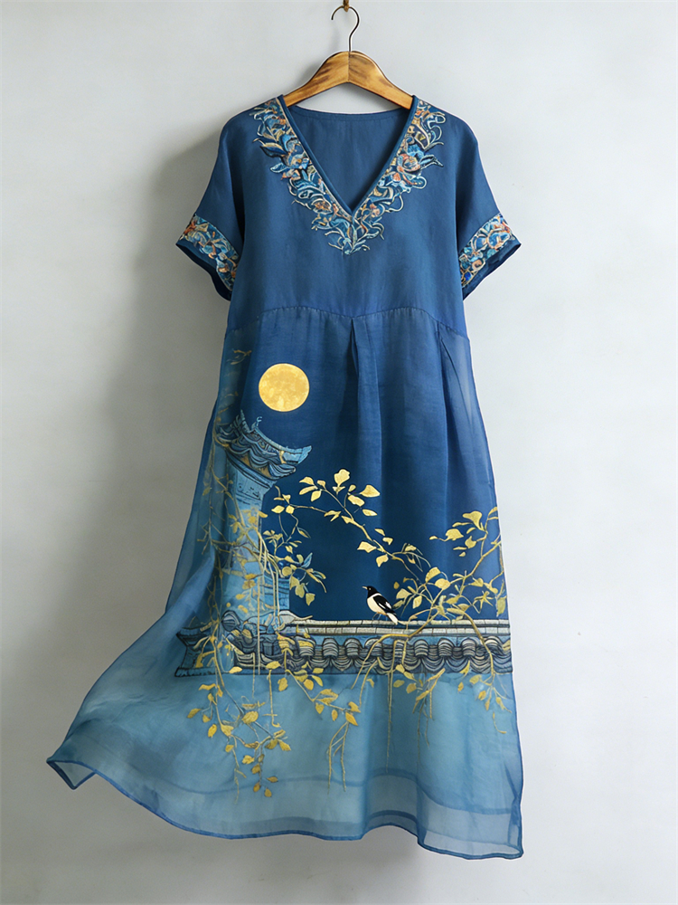 Japanese Birds & Full Moon Scene Flowy Linen Maxi Dress