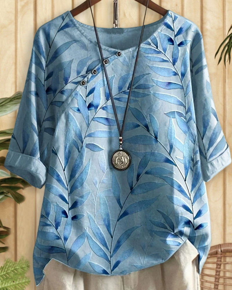 Unusual leaf print blouse with round neck, perfect for daily wear, vacations and casual outings