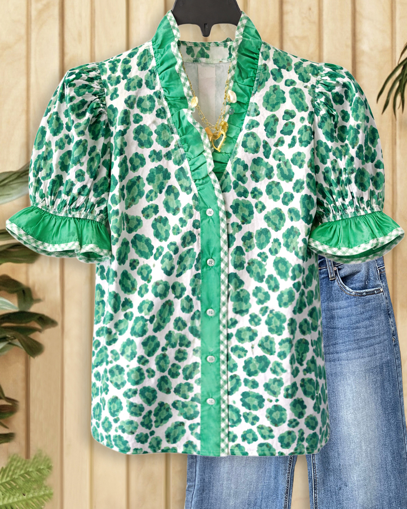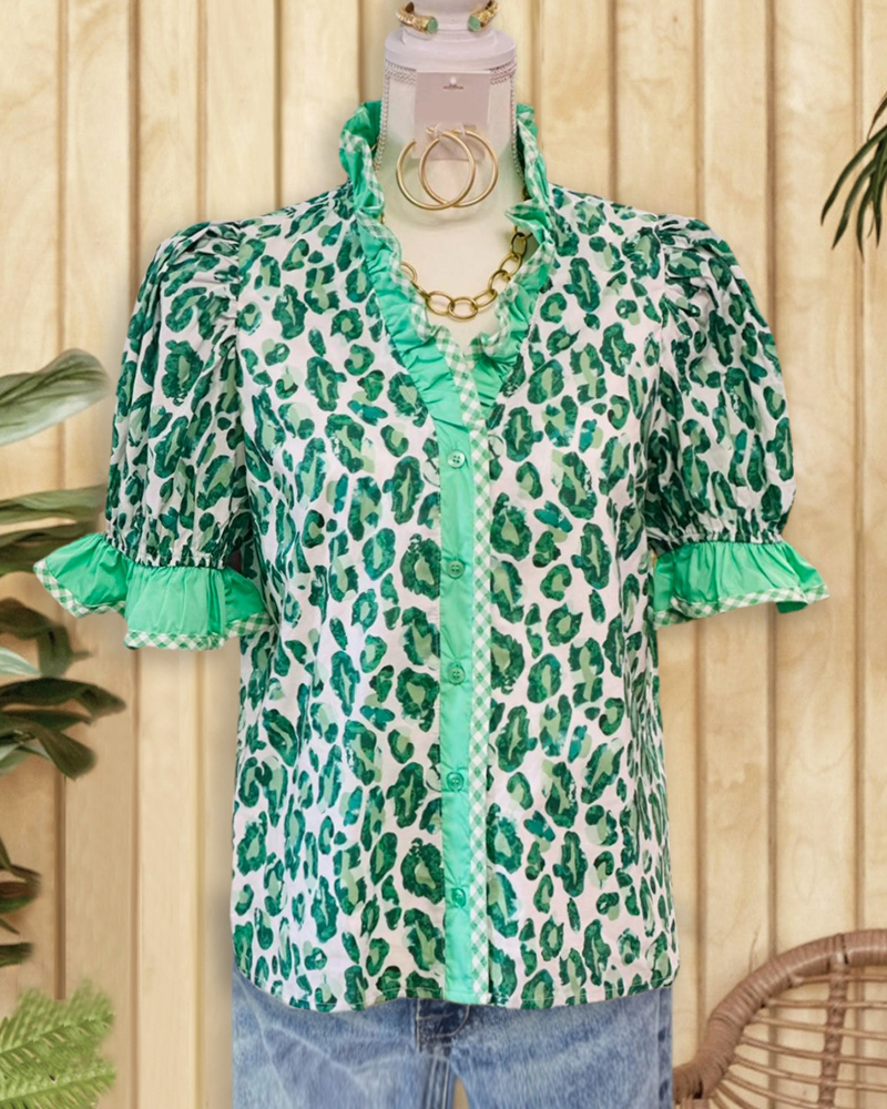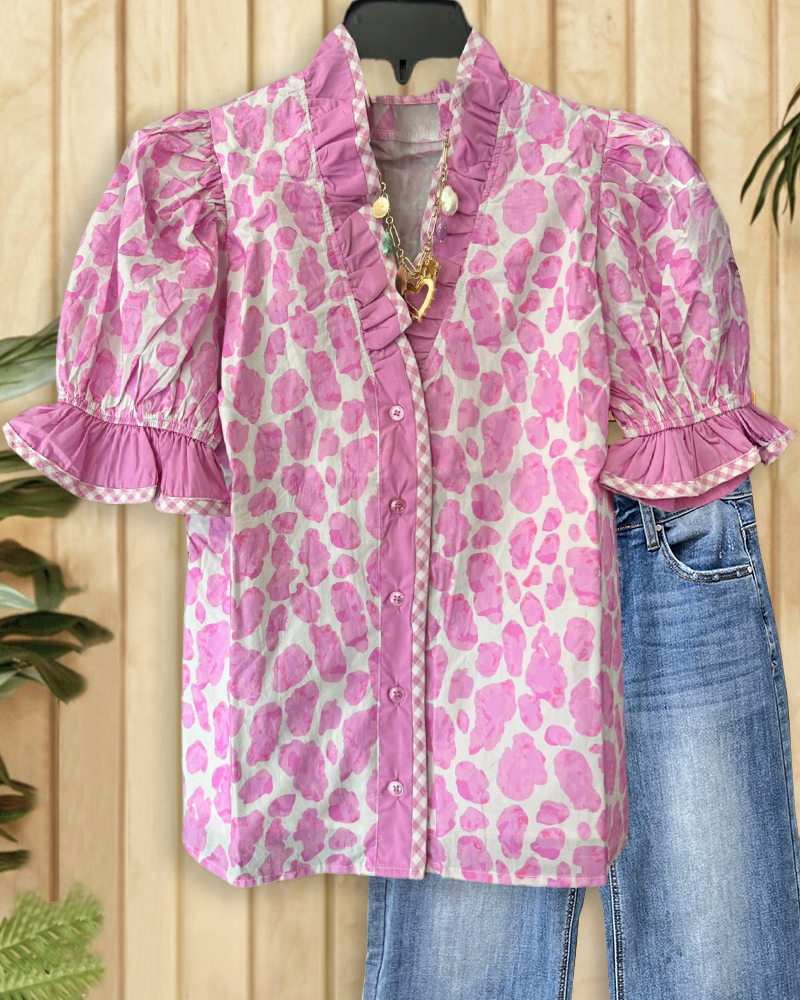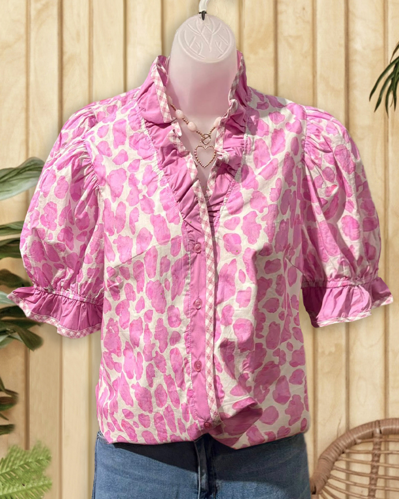 Leopard print button-up blouse with ruffle details, elegant and perfect for chic or office wear