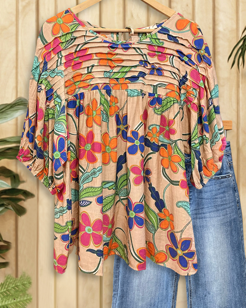 Charming and chic, this pleated floral puff sleeve blouse adds pastoral elegance.