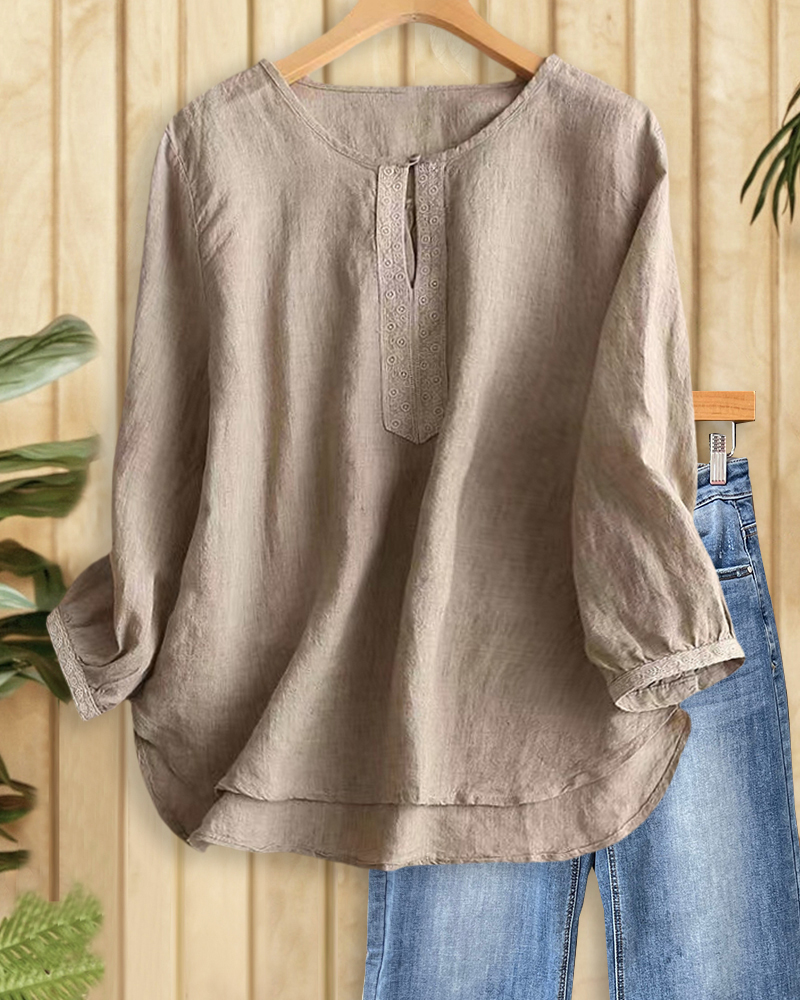 Retro round neck blouse with lacy trim, perfect for casual wear, work, or elegant everyday styling.