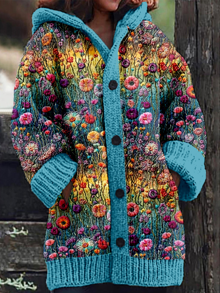 VChics Colorful Wildflower Embroidery Art Cozy Hooded Cardigan
