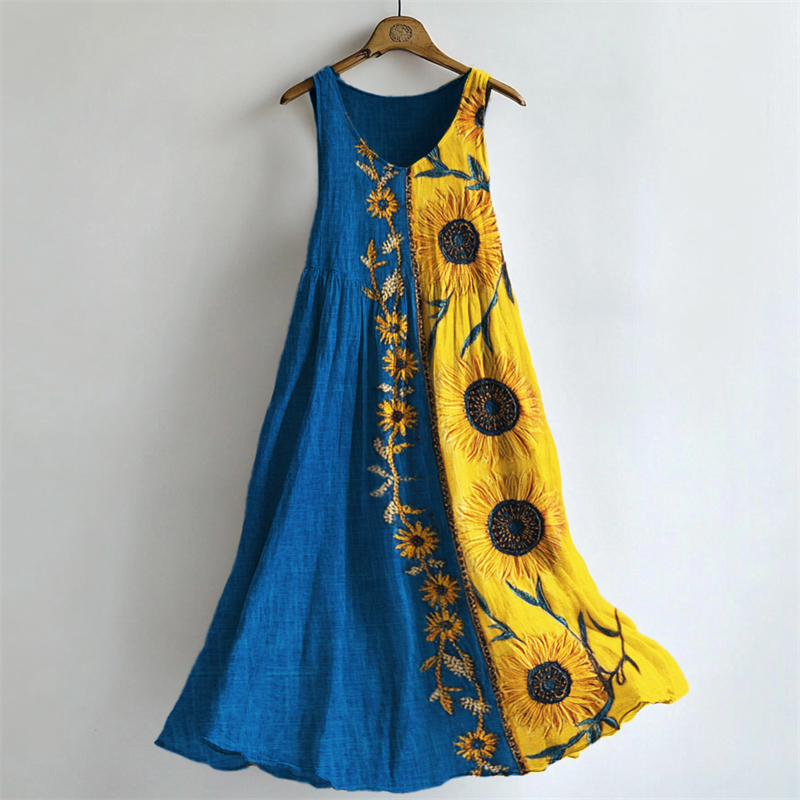 VChics Vintage Boho Sunflowers Embroidered Contrast Patchwork Linen Dress