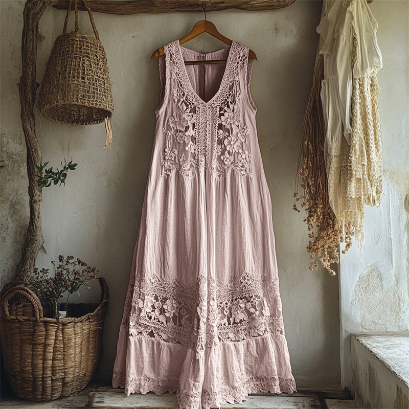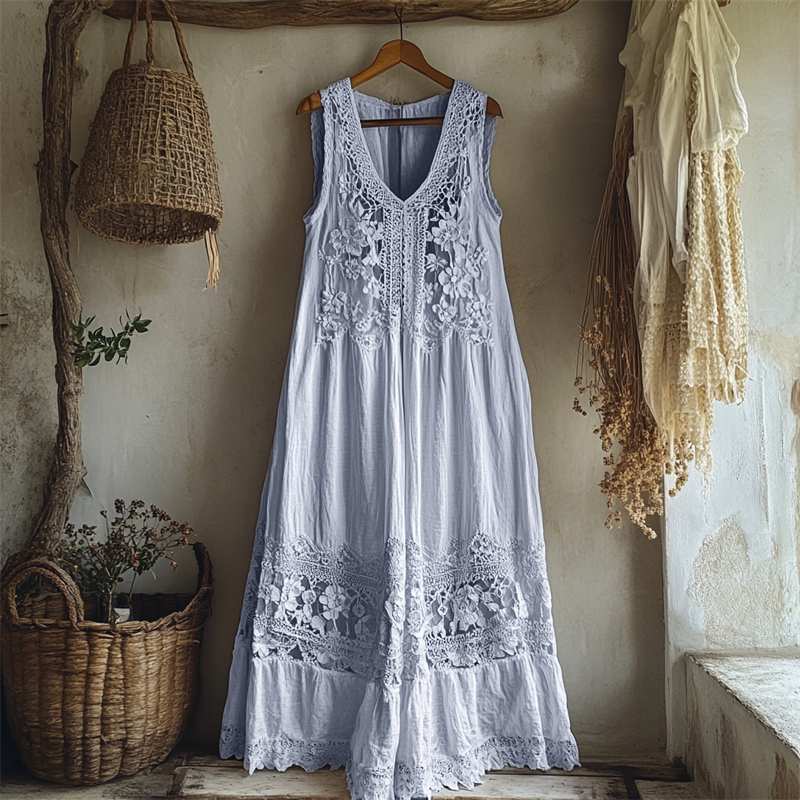 Vintage Floral Hollow Lace Patchwork Linen Maxi Dress