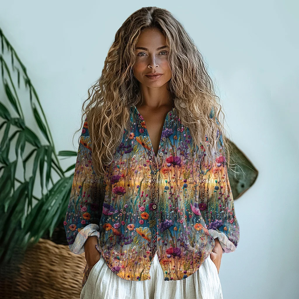 VChics Vintage Gradient Flowers Embroidered Linen Print Long Sleeve Shirt