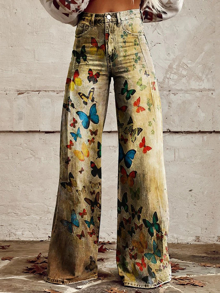 VChics Women's Vintage Butterfly Print Casual Wide Leg Jeans