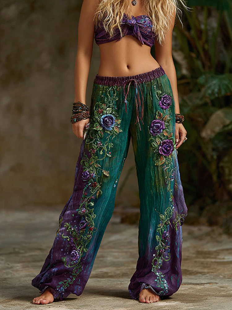 VChics Women's Vintage Rose Floral Pattern Casual Wide Leg Pants