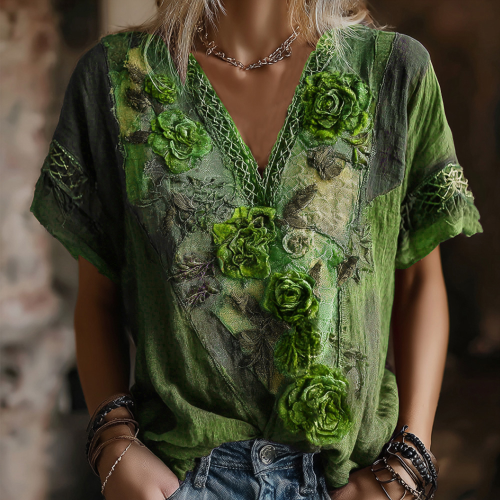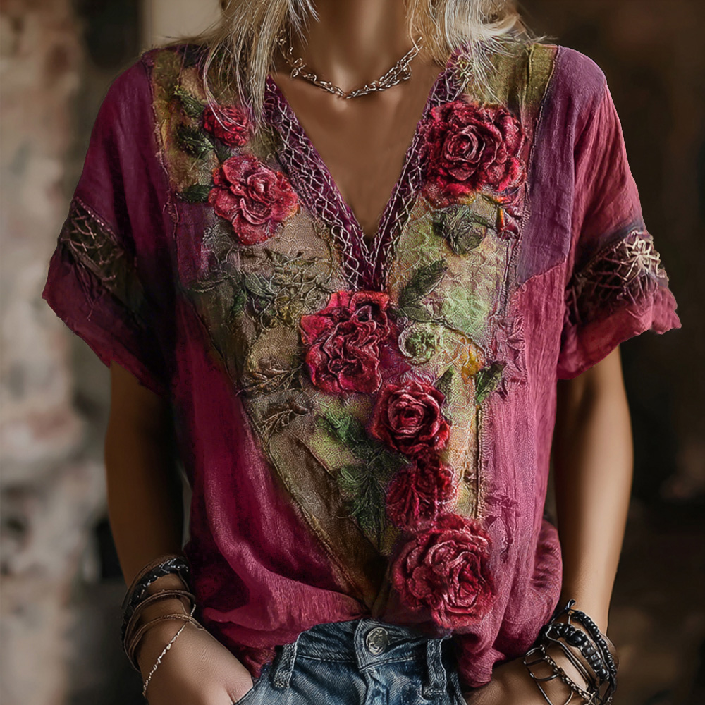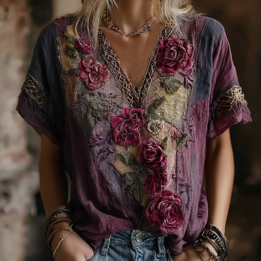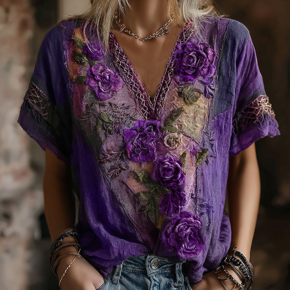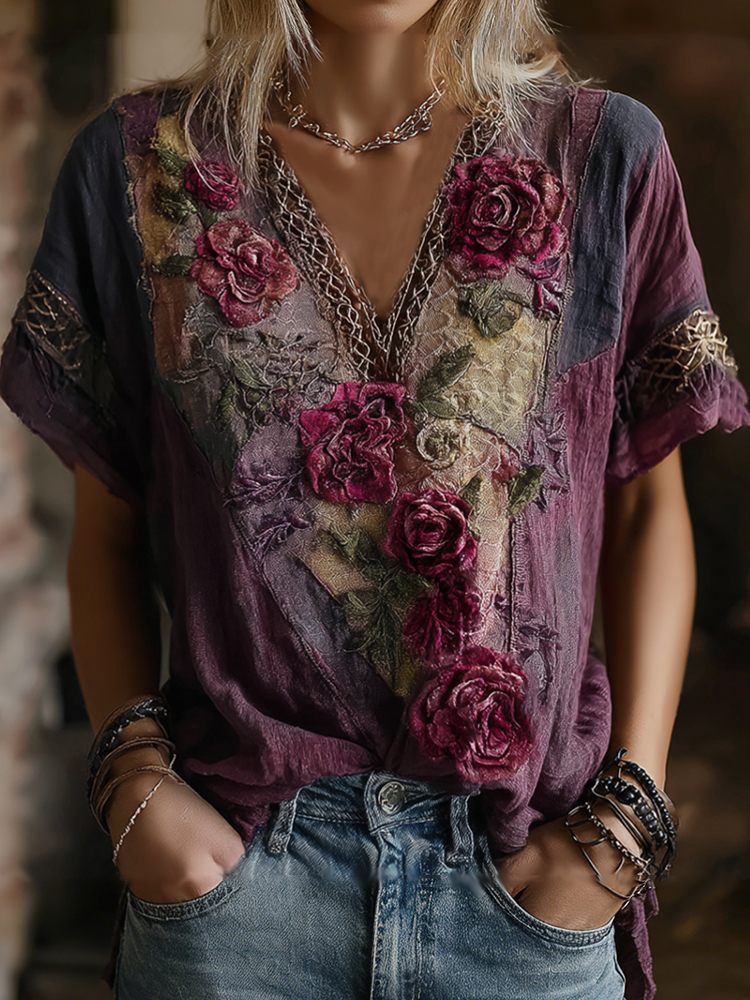 Vintage Faded Rose Woven Embroidered Purple Spliced Cotton-linen V-neck Short Sleeve