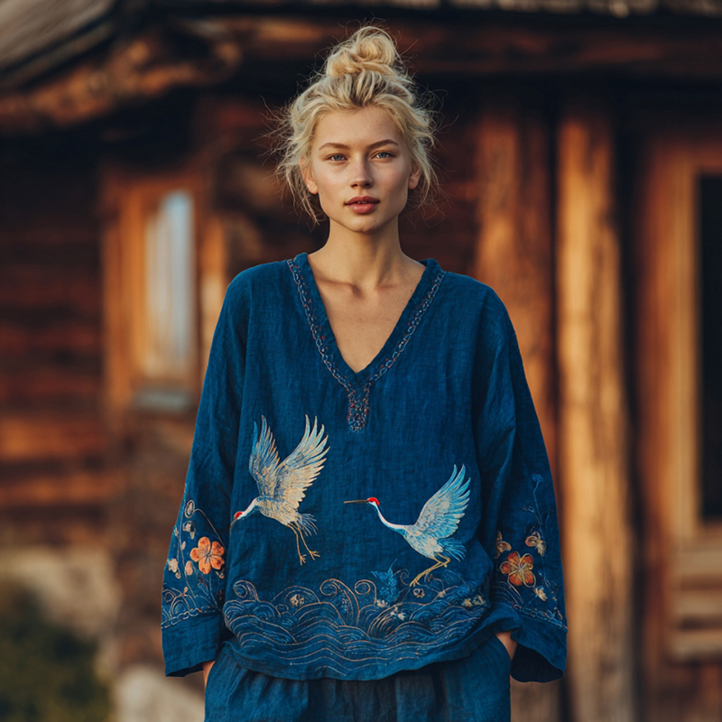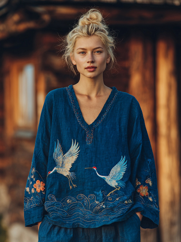 Vintage Japanese Sashiko Floral Crane Art Art Print Linen Tops