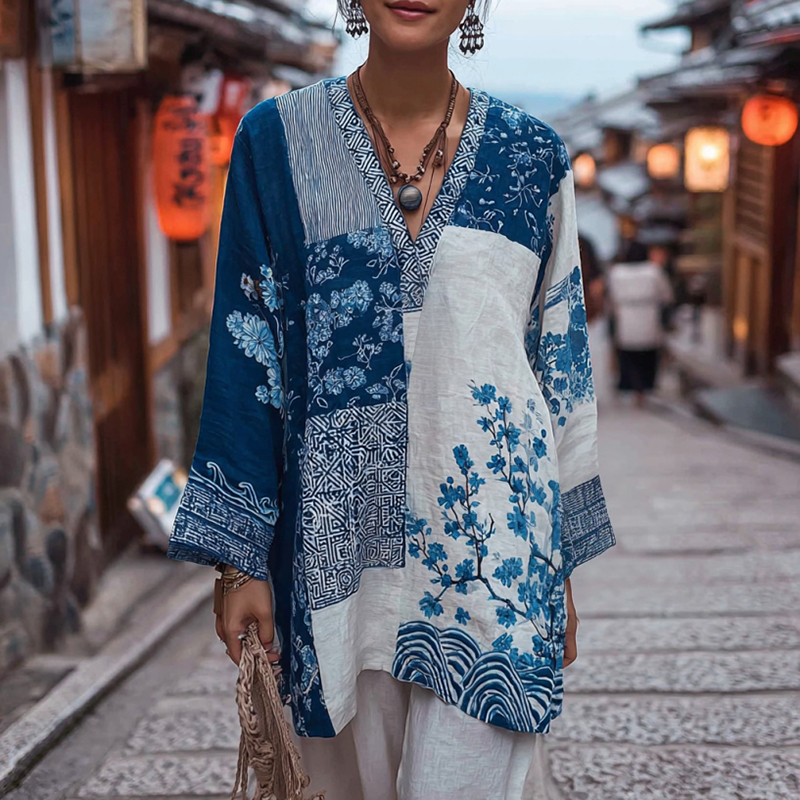 Vintage Japanese Traditional Sashiko Floral Patchwork Art Print Linen Tops