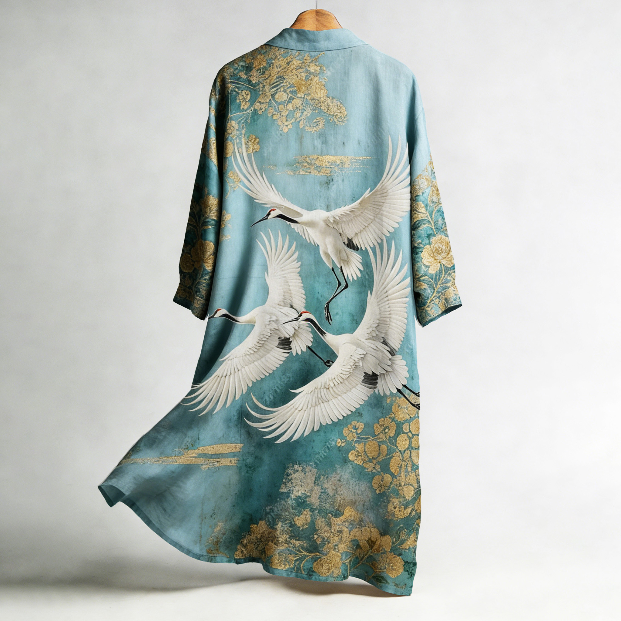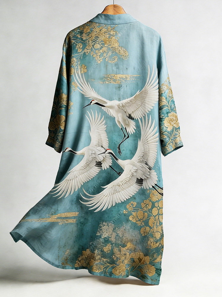 Women's Japanese Crane Flower Art Pattern Linen Long Kimono