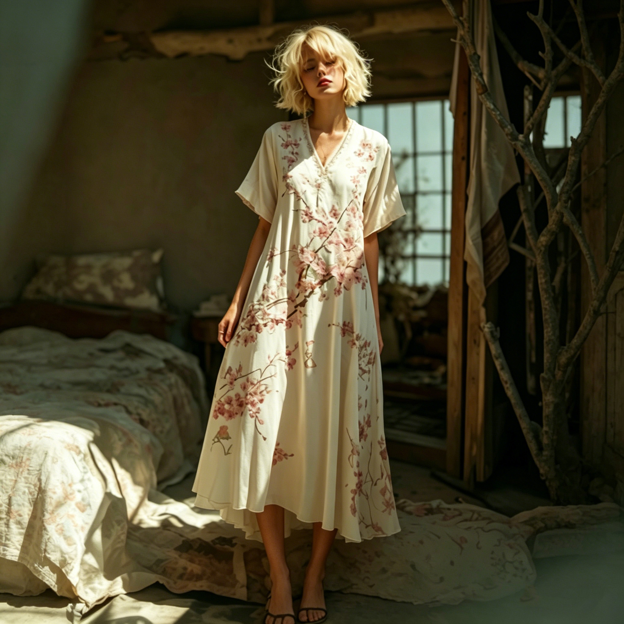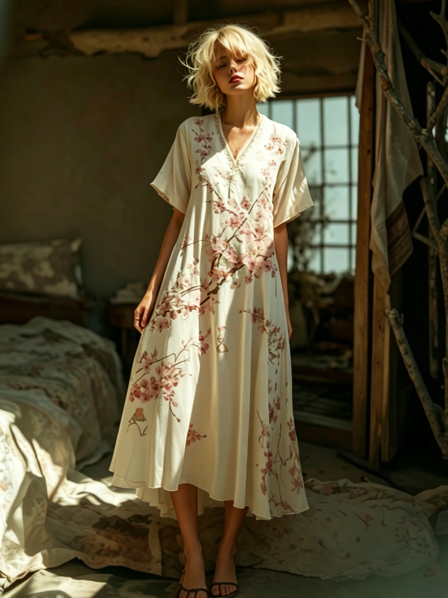 Women's Japanese Floral Art V-neck Cotton And Linen Midi Dress