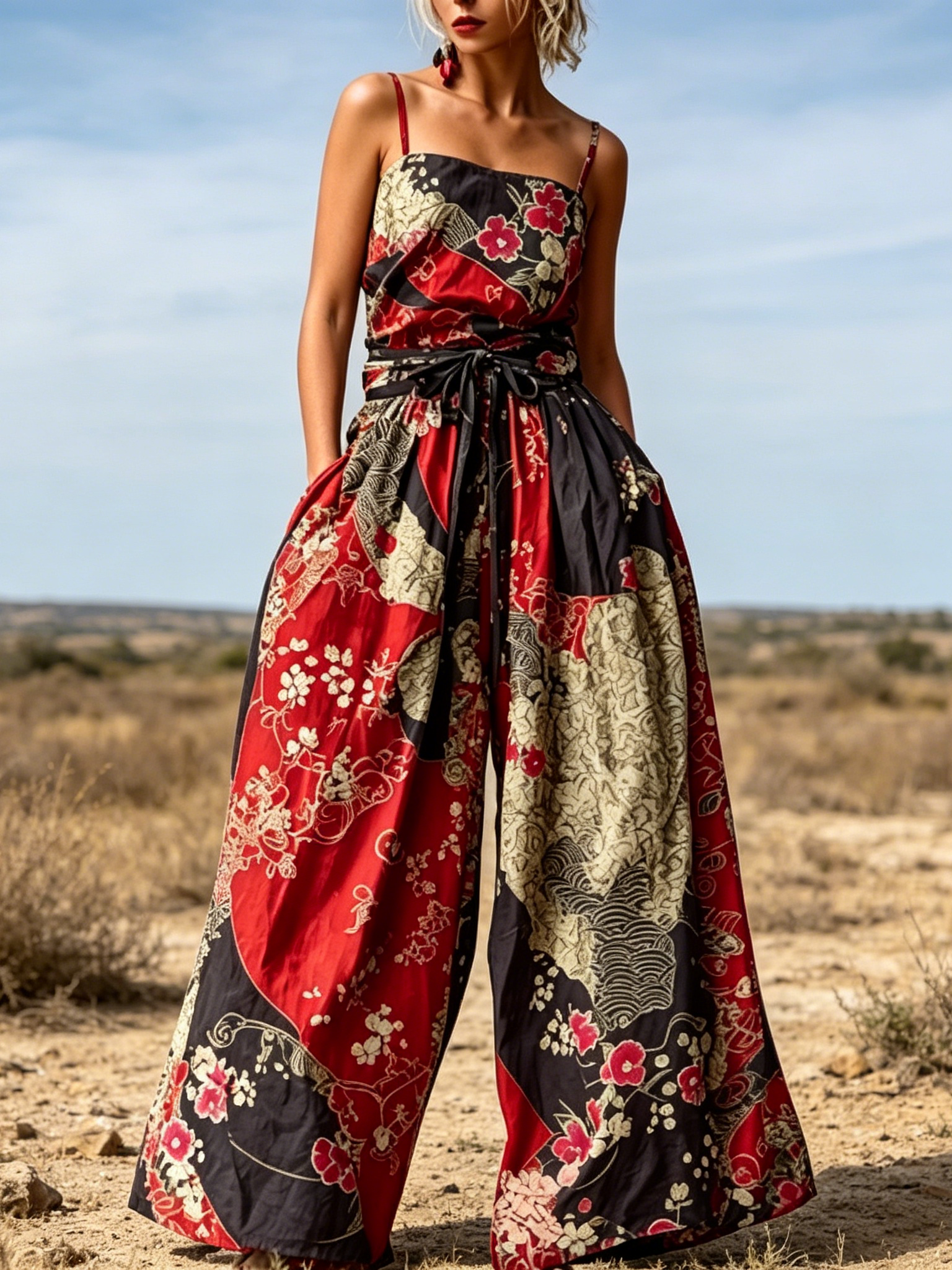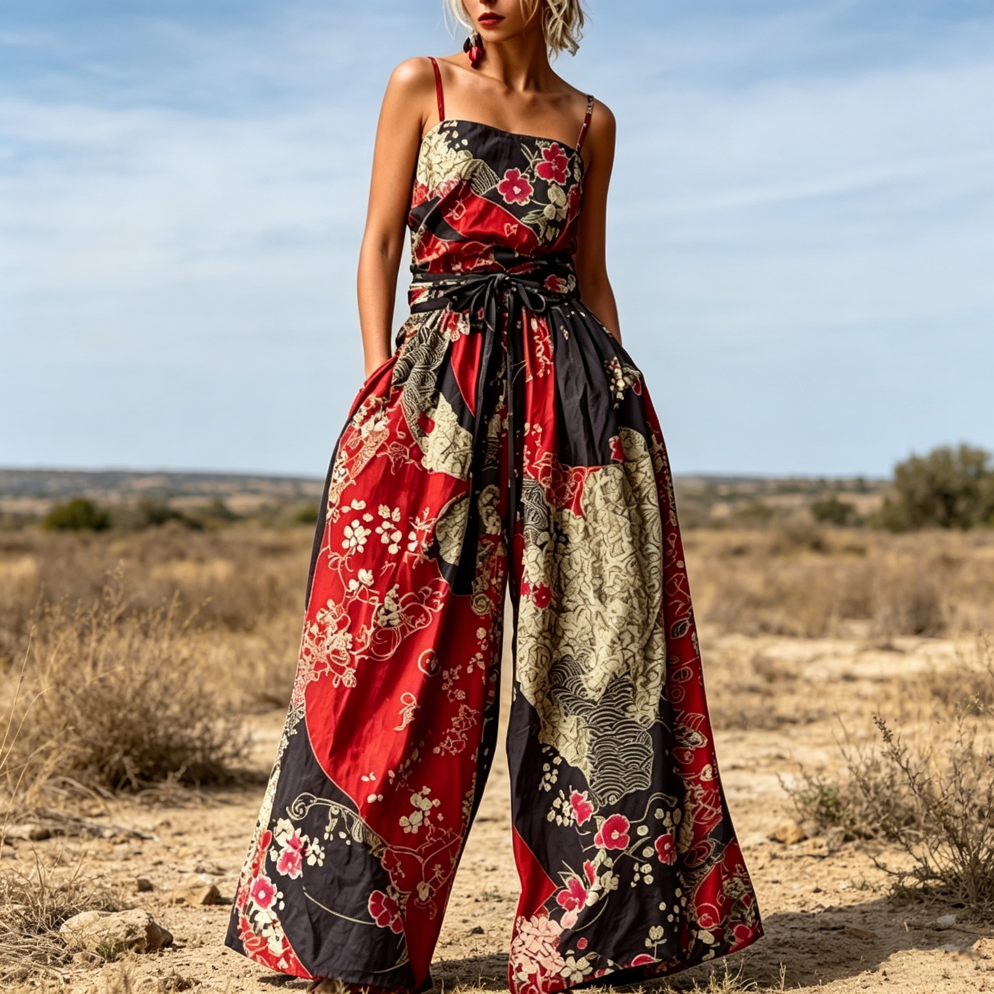 Women's Japanese-style Printed Casual Cotton And Linen Suspender Jumpsuit