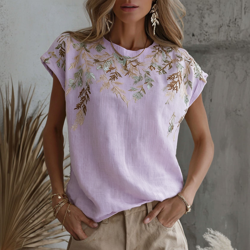 Women's Retro Floral Branch Art Print Linen Blend Crew Neck T-shirt