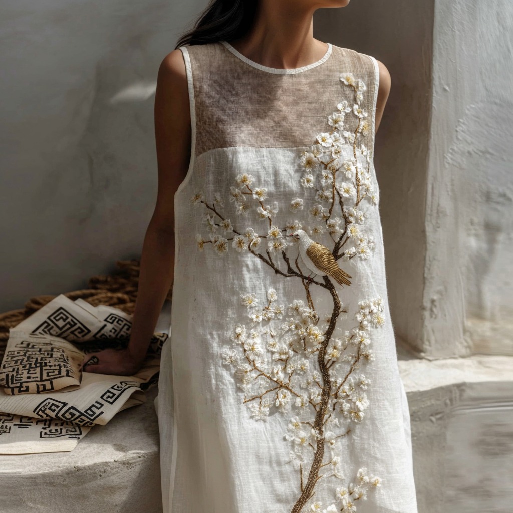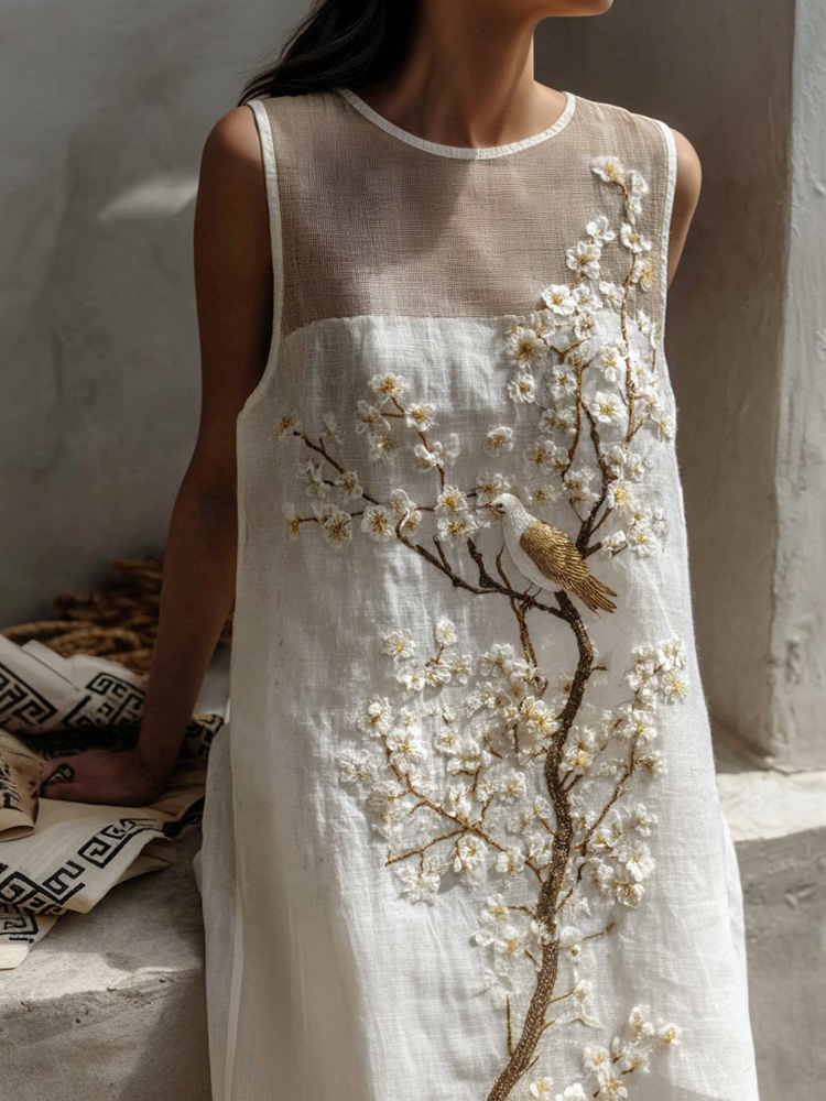 Women's Retro Japanese Cherry Blossom And Bird Art Pattern Linen Blend Short Dress