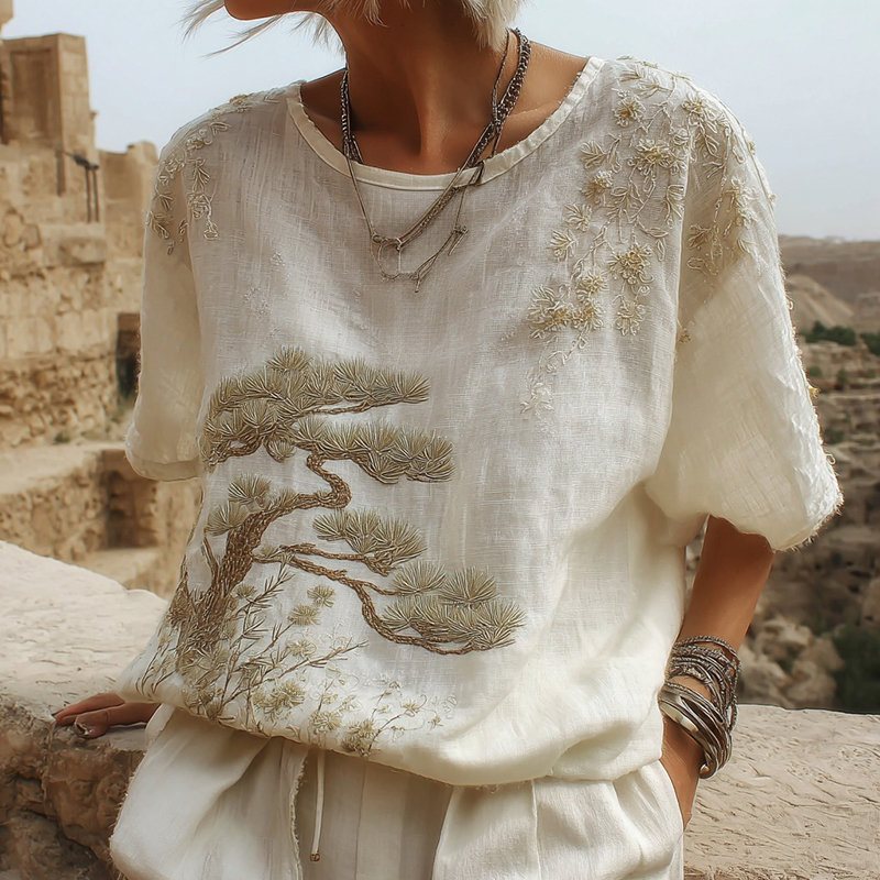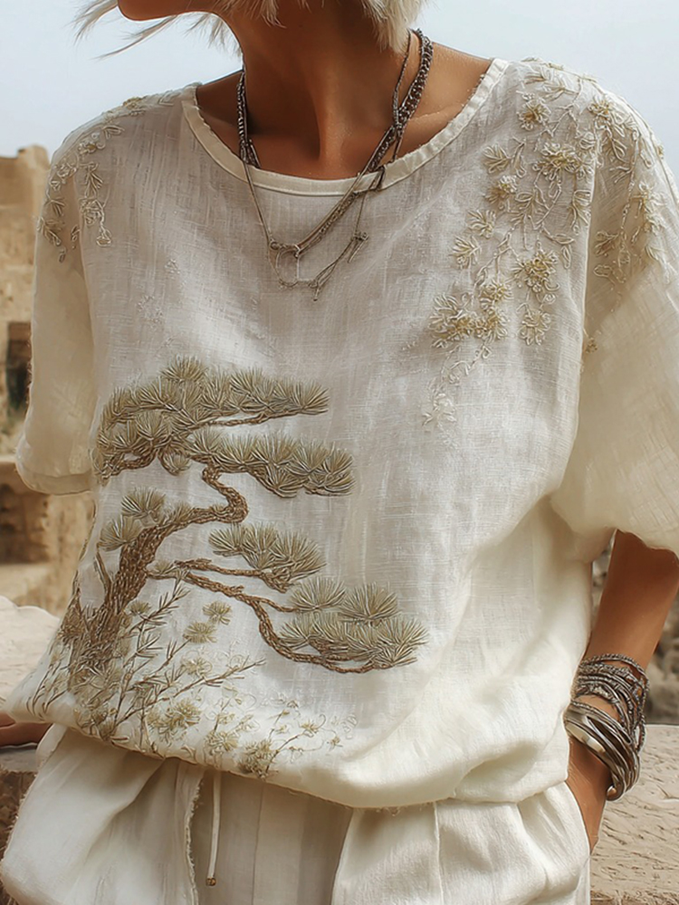 Women's Retro Japanese Pine Tree Art Pattern Casual Linen T-shirt