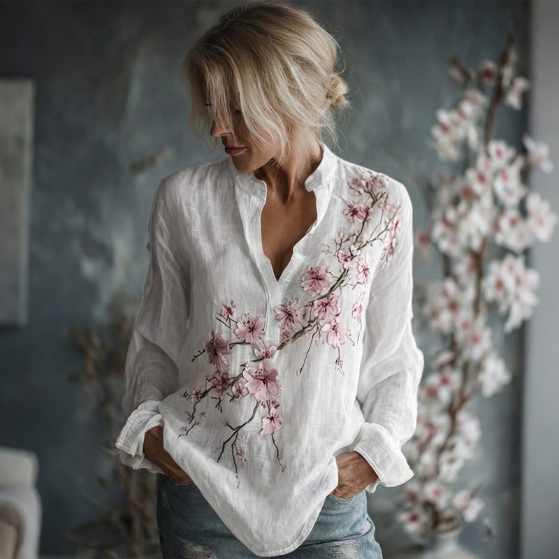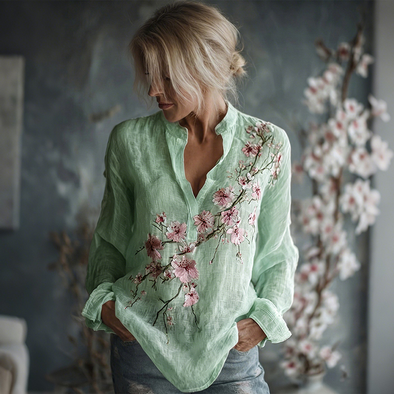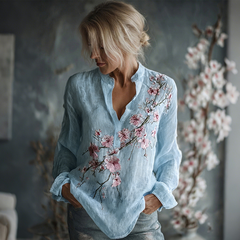 Women's Vintage Flowers Embroidered Linen Long Sleeve Shirt