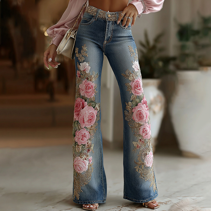 Women's Vintage Rose Floral Embroidery Art Casual Loose Jeans
