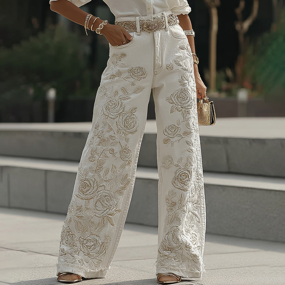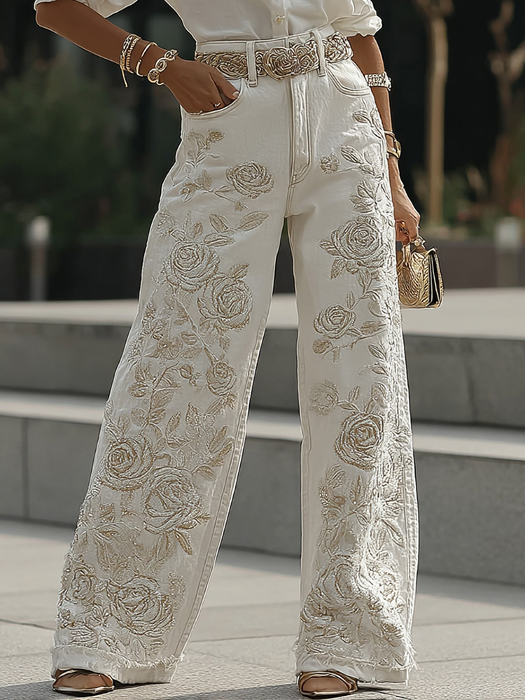 Women's Vintage White Rose Floral Embroidery Art Loose Jeans